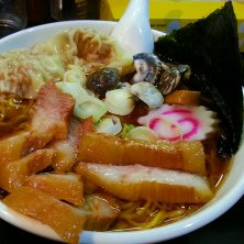 生海苔に真鯛の頭10kg、鮟鱇のアラで取ったスープに貝柱油&海老油をかけたスペシャルラーメン! 超美味しいかった!満腹満足なり。