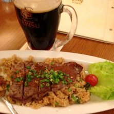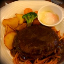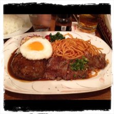 ライオンのスペシャルプレート。ハンバーグと目玉焼きとステーキとスパゲティ。これは、大人様ランチだ。
