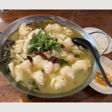ランチの白身魚と高菜の辛口煮込み。ご飯と漬物、デザート付いて880円。安い上にボリューム凄いです。 日本人に馴染みやすい味で、辛口と言ってもそうでもないです。しかも白身魚たっぷり。美味しかった。次も来ます。★★★★★ ただし日本語、ちょっと怪しい。