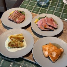 初訪問の新宿のハイアットリージェンシーの一階のブュッフェのレストラン。 最高でした。 ブュッフェだけど全部並んで作ってもらうタイプのブュッフェで、どれも美味かったです。写真はメインのローストビーフと鴨肉とサーモンと真鯛です。どれも3人前ずつお願いしちゃいました🤣