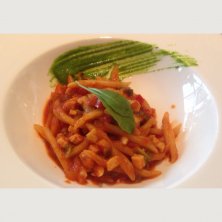 トロフィエパスタ カジキマグロと彩り野菜のラグーソース ルッコラのジェノベーゼ添え
