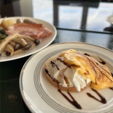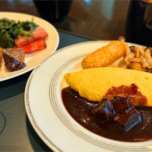 ホテルの朝食ビュッフェでビーフシチューオムレツ。ここ良いホテルだなぁ。