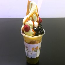 コラボパフェ ソフトクリーム:ミックス(きなこ・抹茶) アイスクリーム:よもぎ 千鳥酢バルサミコソース、八つ橋、ラズベリー、黒豆かのこ、鳴門芋ペースト、米粉クッキー、黒豆パウンドケーキ、白玉、もちもち抹茶ゼリー 京都名匠会にて、京都の祇園きななさんの出店。