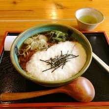 道の駅で山菜蕎麦とネギ味噌おにぎり