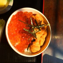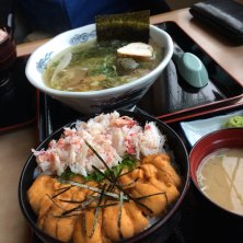 お昼は羅臼の道の駅で、カニとウニ丼(2800円)と、羅臼こんぶラーメン(850円)