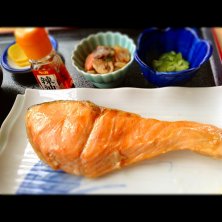時鮭定食。時鮭初めて食べた!脂がのっててウマー(°_°) そして特大な切り身!大きさ比較の為に辣油のビン置いてみた。