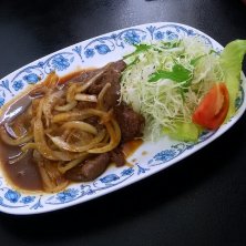 鹿肉の生姜焼き。レバーとジンギスカンのあいだみたいな感じだけど臭みは全くなし!