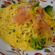 昨日のランチ&ディナー 鎌倉パスタの国産スイートコーンのクリームパスタ 生ハム添え おいしかったけど、接客が(;^ω^)