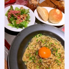 今日は教室の為の装飾品をちょっと買いにお出かけ(❍❛‿❛❍❋)なので、夕ごはんはお外で(▰˘◡˘▰) 蒸し鶏と高菜のピリ辛和風パスタをチョイス( •ॢ◡-ॢ)-♡ パンは食べ放題で、できたてをいただけます(σ≧∀≦)σ