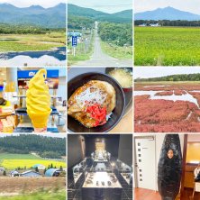 北海道5日目 知床五湖を手始めに、網走、能取湖、斜里、遠軽と回って層雲峡に。 道の駅サロマ湖でお昼ご飯、北海道名物の豚丼、このボリュームで750円ってすごくない?サロマ名産のかぼちゃのソフトも250円て!しかも激ウマ!ソフト評論家のオット氏が、これは今まで食べたソフトの中でもトップクラス!と高評価👍 上真ん中は斜里町の天へ続く道、18kmの直線道路です。右真ん中は能取湖のサンゴ草、下真ん中は遠軽の黒曜石の博物館、下右は黒曜石の顔出し看板にハマる変なオバさん😆