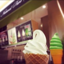 むらさきいもソフト~( ^^)/♡ 試食に置いてあった、さつまいもせんべいをさしてみました(笑)!! 甘すぎず、優しい味わいでした(o゚▽゚)o♪