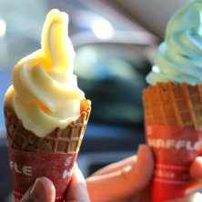 2/11☆昨日のおやつ。 昨日は夫くんの出る自転車の大会にくっついて行きました。イベントのあと温浴施設に行き、お風呂上がりにソフトクリーム。青いのは海のソフト(ラムネ味)、黄色いのがゴールドキウイ味!