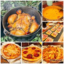 キャンプの日のお昼ご飯 丸鶏のローストチキン マッケンチーズ ピザ2種 照り焼きチキン&マヨ サラミとトマト コンビーフとクリームチーズのカナッペ ポテトサラダとバケット キリングッドエール 雨の中だけど、ダッチオーブンで丸鶏と野菜をロースト!うま〜😍 ピザもピザ窯でパリッと香ばしく! 最高のランチになりました。 これで富士山が見えていれば😅