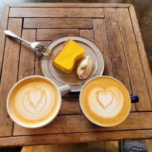 ❤︎カフェラテ ❤︎ジンジャーのスパイスケーキ イズマイさんは今日は撮影でお休みやったのね で、てくてくここまで来てこーしーたいむ☕️ パウンドケーキは袋入りなんでお持ち帰り決定。