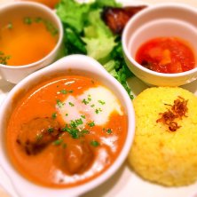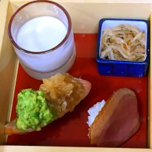 笠原流懐石御膳から 玉葱のすり流し、しらたき山椒煮、大葉胡麻風味のポテトサラダ、合鴨スモーク、銀鮭昆布〆焼き アボカドおろし dancyuフェスティバルにて、東京・恵比寿の賛否両論さんの出店。