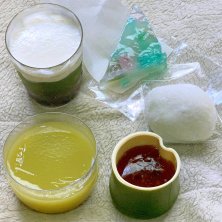 山形・乃し梅本舗 佐藤屋 翠玉 小浜・伊勢屋 和菓子の日 水無月 名古屋・一朶 フルーツ餅 メロン 高島・とも栄 瑞羊羹 青りんご 浜松・巌邑堂 蓮とあずき THE WAGASHIにて。