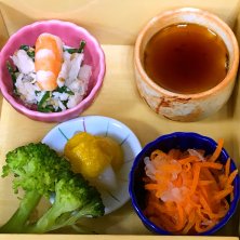 笠原流懐石御膳から 蒸し鶏と春菊の胡麻和え、田楽かぼちゃ味噌、ブロッコリー土佐煮、人参と大根の柑橘系なます、島将プリン 黒蜜風味 dancyuフェスティバルにて、東京・恵比寿の賛否両論さんの出店。