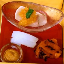 笠原流懐石御膳から かんぱちのたたき チリ酢おろしとニラのピューレ、サーモンの塩昆布和え、アオリイカ あん肝醤油とともに dancyuフェスティバルにて、東京・恵比寿の賛否両論さんの出店。