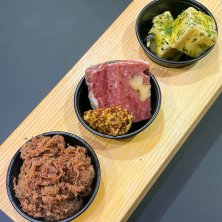 選べるおつまみセット 北海道チーズと黒オリーブマリネ シャルキュトリー(エゾ鹿と胡桃のテリーヌ) 十勝ハーブ牛のコンビーフ 初夏の大北海道展の北海道ワインバルにて。