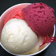 ジェラート ラージ もも、プラム、北海道産いちごのソルベ、北海道ミルク 秋の大北海道展にて、千歳のジェラテリア ミルティーロさんの出店。
