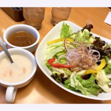 フットサルの大会後にチームメンバーと祝勝会(^o^)メッチャ疲れたけど結果が良くて、ご飯も美味しかった(≧∇≦) 本日のメニューは スペシャルトリオ(ハンバーグ150g•チキン100g•ソーセージ2本)、ライス大、スープ(コーンとクラムチャウダー)♪