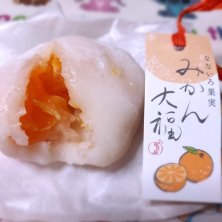 食後のデザート みかん大福 気になってつい買ってしまった❗ みかん柔らかい❗ 味はみかん酸っぱさを大福の甘さでカバーしててちょうどいい😊