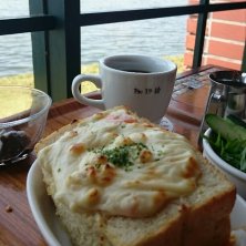 島根県松江市にある宍道湖湖畔の喫茶店にて、ハイクオリティ喫茶発見 旅先でこんな出会いがあると嬉しいー! 写真はハムとほうれん草のグラタンセット。パンはイギリスパン、フランスパン、クロワッサンから選べた!涼しい季節なら湖畔キワキワのテラス席もいいね