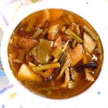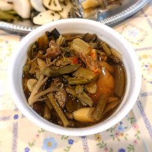 山菜汁。 @大石田町の新そば祭り 山菜、キノコ、鶏肉。 具だくさん。せいろみたいにして食べてみた。