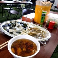 各テーブルには漬け物。 山菜汁は出店で購入。 #大石田町新そばまつり #ぺそら漬け