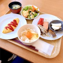 私の朝ごはん イカ刺し、鹿ジンギスカン、ホッケなど。たまごかけごはんも美味しかった。