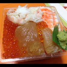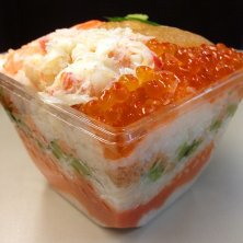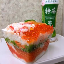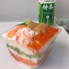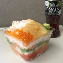【贅沢ミルフィーユ&黒烏龍茶 香るジャスミン】 大丸地下のタキモトで、今日の旅のお供と無事合流できた! ほな、いってきま〜す!(⌒▽,⌒)ゞ 上段:えび、かに、いくら、数の子、わさび 中段:サーモン、野沢菜、鮭フレーク、明太子、キクラゲ