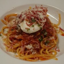 リングイーネ アマトリチャーナ ポーチ・ド・エッグを添えて