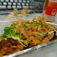 二の酉やってる。 たこ焼き買って自席で食べる 休日出勤の一場面 タコ、全然入ってない… …なんて日だ‼️