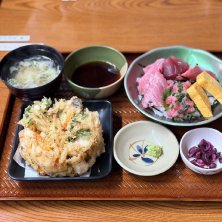 今日は大洗までバイクツーリングにやって来ました( 'Θ')ノ☆ 開店前から並んで入った「かあちゃんの店」。 限定20食のマグロ丼定食に、かき揚げを追加。 かき揚げの中にはホクホクの白身魚か入っていて、めっちゃ美味しい! マグロも筋もなくトロリとして、めっちゃ美味しい! 朝ごはん我慢していてよかった♬