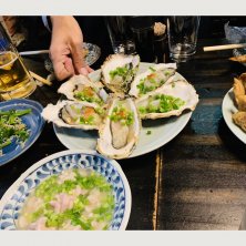 2年先しか予約が取れない店。 生牡蠣、白子、エイヒレの唐揚げ。