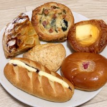ほうれん草とベーコンのパン、はちみつとクリームチーズデニッシュ、伊豆大島さくらあんぱん、あんバター、紅茶とオレンジのパイ、オレンジとバニラのスコーン