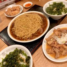 名代 成駒屋 の 名物 名代焼きそば のBセット ミニ豚丼とスープです Aセットが 焼きそば大盛り+ミニ豚丼orミニカレー Bセットが 焼きそば 並+ミニ豚丼orミニカレー Cセットが ラーメン+ミニ豚丼orミニカレー と なっとりました