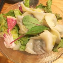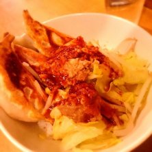 立吉の揚、焼、プリプリ海老餃子、バジルと大葉のサラダ餃子 あっちもこっちも中途半端に締めたりラストオーダーにしやがって! 年が変わってますます奇妙な世の中、 そんな中、気になってた人気の餃子居酒屋さん なのにガラガラで、閉店してると思ったら やってて、ラッキー!! 食べたかったアンチョビポテトは売り切れで それ聞いた瞬間、今日はこんなダメダメな日と思ったけど、 トータルで見たらラッキーに違いない! そんな夜