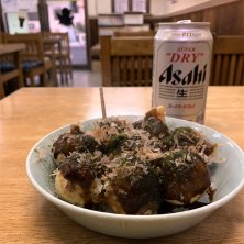 【大倉たこ焼き店】 たこ焼き8個、発泡酒で350円なり 昭和レトロな名店🎵 独りお疲れさん会🤣 熱々のたこ焼きをキンキンに冷えたもんと合わせる! 上鳥羽口での用事を済ませて昼飯の後、 帰路、石山で途中下車した