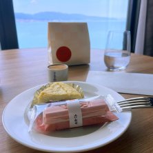 オウミーな日 2 ◉ たねや ふくみ天平さくら ◉フロマジェリーアルモニー リコッタ・ゴルゴンゾーラフォルテ レアチーズケーキ 近江な景色と比叡山が輝く大津におの浜 僕ら夫婦がプリンス好きになった記念すべきとこ 以前トラブルがあった時にここの若いスタッフの対応に感動し、プリンスがあるところは基本はプリンスホテル系列に泊まる様にしています 今回は来る予定無かったのですが、超お得だったので女房殿のワーケーションも兼ねてノマド ラーゴで買った和菓子とレアチーズケーキとカフェでまったり中