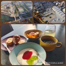 11/14日(土) 朝食バイキング後は、持って来てたフルーツとヨーグルト、パンに🍞🍴⑅*॰ॱ ホットコーヒー☕とりんご酢🍎で 美味しくいただきました(๑>ڡ<๑)🍴💕 38階からのビューは、絶景😍