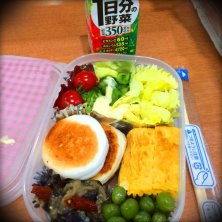 チーズinはんぺん 玉子焼き 生野菜 茄子の煮浸し ウグイス豆 野菜ジュース 玄米ご飯 ※連れは、キャベツ焼きとか 食べてた(^^;;