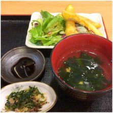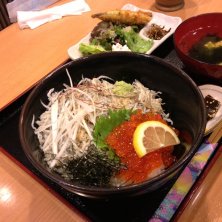 お昼ごはん 釜揚げシラス丼❤︎ シラスがふわっふわです☻。 あまり写ってないけど、サラダの上には小魚の素揚げが乗っていて、それもまたパリパリで美味しい❤︎。 セットで520円というお値段もビックリでした☻。