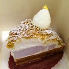 媛かぐやのタルト 500円 愛媛県産新品種の里芋、媛かぐやを使ったタルト。 ねっとり、ほくっとしたやさしい味わいの里芋。 センターの里芋だけでなく、タルト生地やアーモンドクリームにも媛かぐやを使っているみたい。 表面を覆うのはピスタチオ風味のクランブル、生クリームは上にのってるのが間にあるのより甘くなってます。 それぞれ個性的なパーツですが、全てを一緒に食べた時に、一番美味しく感じてしまう不思議なケーキでした♡