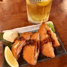 ハムカツに水爆(ビール+デンキブラン+レモン)。しみるなあ。