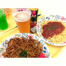朝から、箱根ユネッサンで大はしゃぎ。 温泉? プール? サイド お決まりの焼きそばとミートソース。
