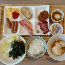 バイキングの朝食 佐渡島産コシヒカリ、鶏肉団子入りの湯豆腐、その他はよくあるメニュー🎵