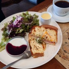 相方セレクト 『クロックマダムのモーニングプレート』 680円+本日のコーヒー500円 (ホットおかわり無料) サラダも山盛りで満腹〜 カツサンドのプレートも、ボリューミーでオトクな気がする 今度はチャリンコモーニングかな 相方はこの店に来るなり「このエレベーター、人が乗ったらあかんやつや」と😅 近々着工の現場が近いらしく、担当する同僚に「荷物用エレベーターに乗るカフェがあるから始まったらぜひ」と宣伝したらしい笑