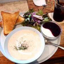 ドライブモーニングは『北摂焙煎所』 私セレクト 期間限定『濃厚きのこのクリームスープモーニング』 680円+アイスコーヒー500円 (ホットおかわり無料) スープおいしーい! パンにははちみつバター🍯 コーヒーは、アイスもホットもおいしいし、モーニング以外の他のコーヒーもリーズナブル 2週間ほど前、9時に来たらめっちゃ並んでたので、今日は8時を目指す! と言ってたのに、起きたら7時20分で、2人でビックリや