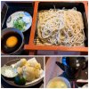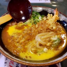 上カレーうどん小盛(えび天ぷらと、他野菜天ぷら)、トッピングにたまご🍤 カレーうどんが無性に食べたくなって。 はねないよぉに、専用の紙エプロンして頂きました🤭 辛口やけど、たまごトッピングしたんで、まろやかになりました🎵